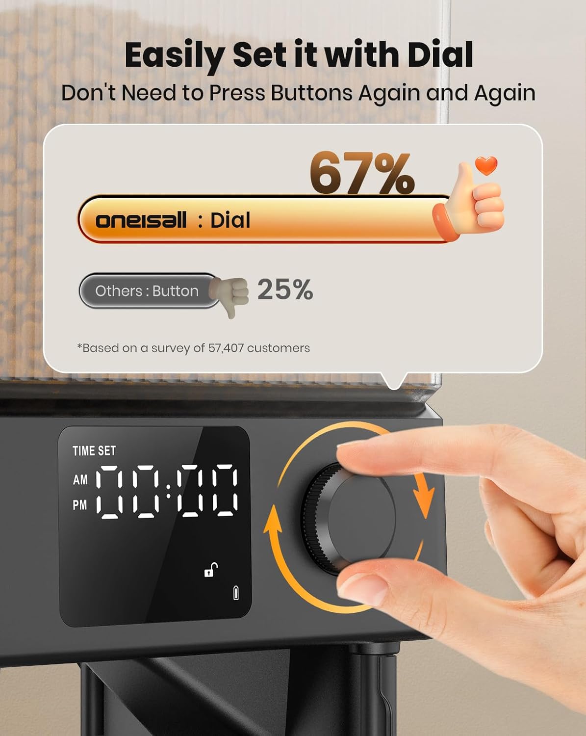 - Easy to Set Up: oneisall automatic cat food dispenser has a dial to simplify the programme. Everyone can easily set up it and control feeding