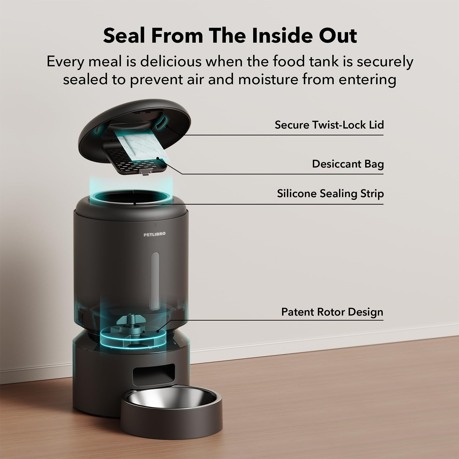 - Freshness in Every Bite: Patent rotor in the tank base and twist-lock lid of the automatic pet feeder prevent pets sneaking into the food dispenser for extra food. Built-in desiccant bag and sealing strip keep food fresh and crunchy. Food-grade stainless steel bowl provides healthy and hygienic feeding, saving your pets from chin acne.